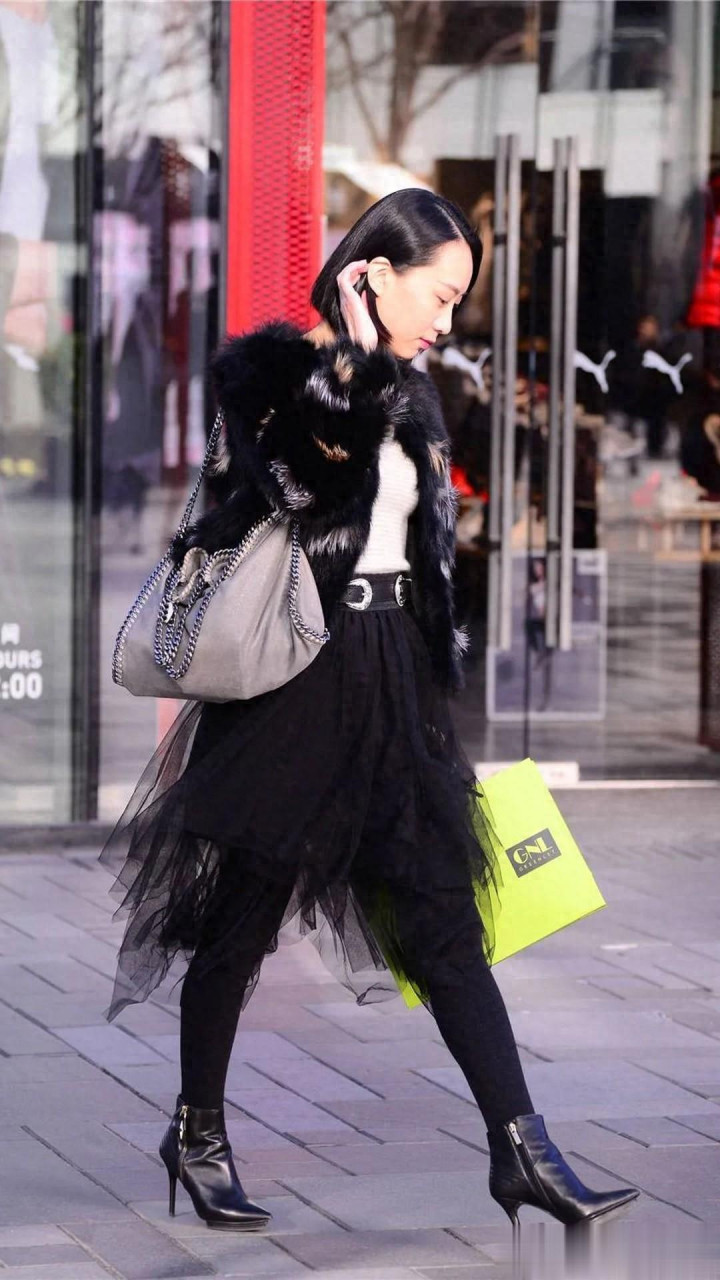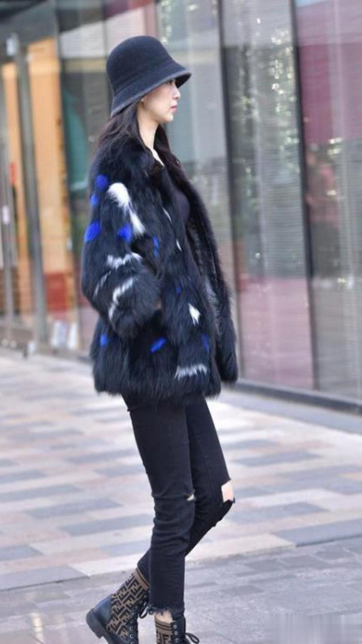 看了街的美女才知道: 要把黑色皮草穿出活力范, 浅色点缀少不了